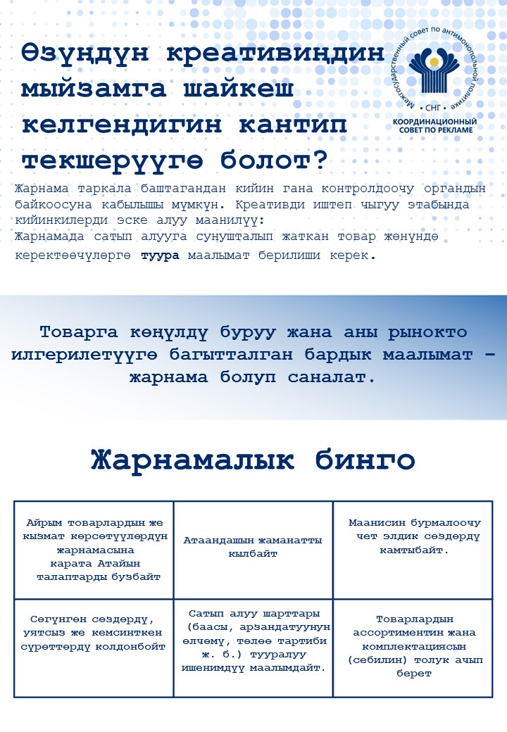 2023-жылдын 29-июнь күнү жарнама агенттиктеринин өкүлдөрүнүн катышуусу менен Кыргыз Республикасынын жарнама жөнүндө мыйзамдын талаптарын сактоо боюнча отурум өттү. Отурумда административдик жоопкерчиликти, жарнама эрежелерин жана жарнама жөнүндө мыйзамдарды сактоо зарылдыгын жөнүндө түшүндүрүү иштери жүргүзүлдү. Андан тышкары жолугушуунун катышуучуларына Монополияга каршы саясат боюнча мамлекеттер аралык кеңештин алдындагы Жарнама боюнча координациялык кеңештин “Жарнамалык сабаттуулук” маалыматтык кампаниясынын алкагында даярдалган жарнамалык макеттери тартууланды. Ошондой эле […]