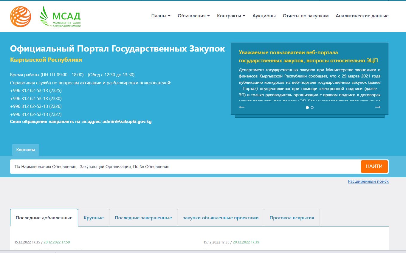 Служба антимонопольного регулирования при МЭК КР представляет информацию о проведенных процедурах государственных закупок за 2 квартал 2022 года